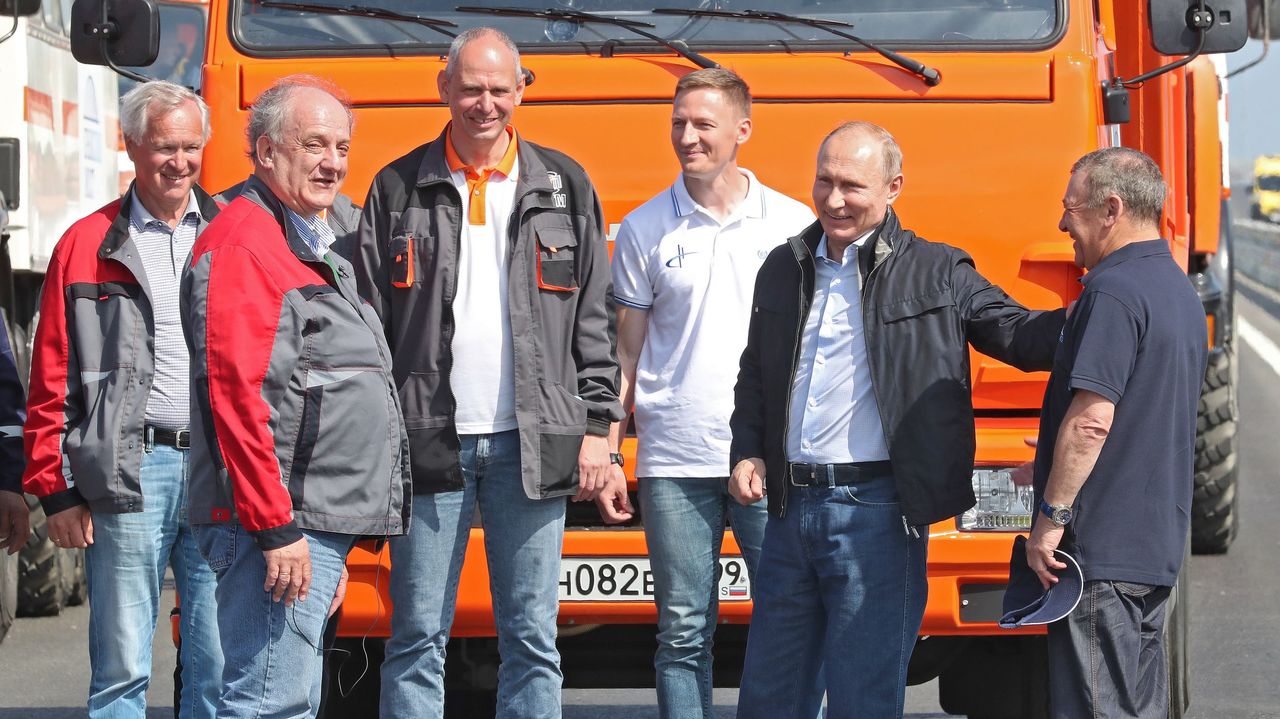 Президент Российской Федерации Владимир Путин за рулём КамАЗа проехал по Крымскому мосту со стороны Тамани. В колоне автомобилей вместе со строителями по мосту также проехали Президента полномочный представитель Президента Российской Федерации в ЮФО Владимир Устинов, Глава Республики Крым Сергей Аксёнов, Губернатор Севастополя Дмитрий Овсянников, Губернатор Краснодарского Края Вениамин Кондратьев.